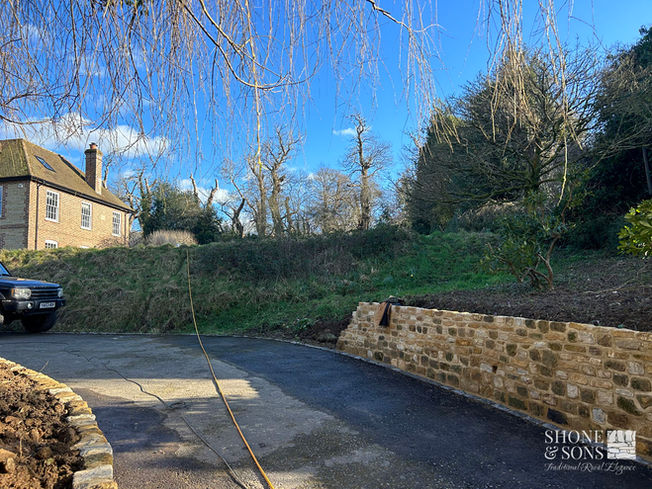 The retaining walls were built using local stone, chosen for its natural beauty and to blend seamlessly with the surrounding landscape. The craftsmanship in the stonework ensured that the walls not only served their structural purpose but also added character and elegance to the entrance. The soil removed during the process was repurposed—excess soil was taken by a local farmer to fill gullies in his field, while the remainder was used to backfill the walls.